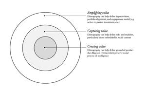 When it comes to value creation, ethnography provides a valuable tool for identifying socially grounded, nuanced product evaluation criteria. In the case described above, these criteria became the foundation for product due diligence (combined with more standard criteria, e.g. target organization leadership), with each criterion linked with overall investment principles. ‘Supported agency’, one of the defined opportunities, resulted in initial criteria, such as: