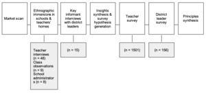 Initial ethnographic immersions were focused on collecting a broad range of perspectives from classroom ecologies, with a focus on teachers as primary decision-makers. This part of the study involved 56 teachers and administrators and included nine school observations, allowing researchers to build a broad dataset. The team interviewed 48 teachers from a diverse range of subjects, grade levels, and experience levels, spending more than 244 hours in classrooms and teachers’ homes. Additionally, the study incorporated interviews with eight school administrators (principals, assistant principals, superintendents). A range of school types were included: 7 elementary schools, 7 middle schools and 3 K-12 schools, as well as small, medium, and large districts (5, 6, and 6 respectively). Given the scale of the US public school system, the majority of the sample was composed of public schools, with two private or charter schools per state for additional perspective. The grade and subject distribution included kindergarten through eighth grade, and subjects such as social studies, math, language arts, science, language/ESL, and others.