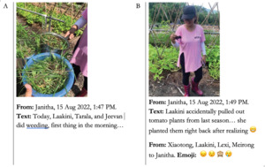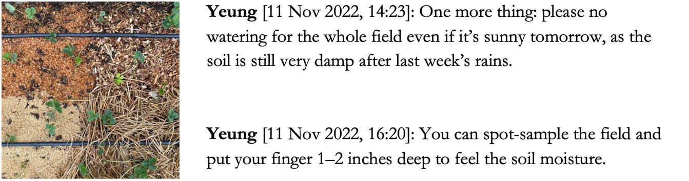 Episodes like these brought home the fact that interactions with nature can lead to unintended consequences beyond human control since uprooted tomatoes do not grow back. In another episode, the farm manager Yeung invited volunteers to harvest turmeric that had been planted years earlier. In a WhatsApp message (12 Nov 2022, 6:05 PM), he pinpointed the bed of turmeric that was ready to be harvested. Soon, however, a volunteer commented on the erratic shape of the root. Over the next four days, Yeung became aware of look-alikes, close relatives of turmeric that have medicinal and, by implication, potentially toxic side effects. He encouraged volunteers to send him images of the blooming plant for research purposes. Within 34 minutes, three volunteers had submitted previously unshared images of turmeric in blossom. These images were inconclusive for plant identification, but two days later, Yeung had tracked the previous farmer. He had also cooked the plant by himself. He was able to confirm that the plants were, in fact, turmeric and safe for human consumption, and encouraged volunteers to use them in the kitchen.